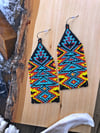 Awasishkode | Beyond the Fire :: geometric beaded earrings. Handwoven with glass seed beads in colors matte black, turquoise, maroon red, coral, & yellow.